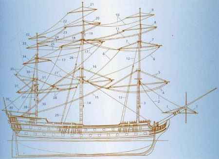 1 - блинда-топенанты; 2 - блинда-трис; 3 - гардель фока-рея, 4 -фока-брасы; 5 - фока-топенанты; б - фор-марса-брасы; 7 - фор-марса-топенанты; 8 - фор-брам-топенанты; 9 - фор-бом- брам-топенанты; 10 - фор-бом-брам-брасы; 11 -фор-брам-брасы; 12 - фор-марса-дрейреп; 13 - фор-марса-фал; 14 - гардель грота-рея; 15 - грота-брасы; 16 - грота-топенанты; 17 - грот- марса-брасы; 18 - грот-марса-топенанты; 19-грот-брам-фал; 20 - грот-брам-топенанты; 21 - грот-бом-брам-топенанты; 22 - грот-бом-брам-брасы; 23 - грот-брам-брасы; 24 - крюйс-бом- брам-брасы; 25 - крюйс-брам-брасы; 26 - грот-марса-дрейреп; 27 - крюйс-марса-брасы; 28 - бегин-брасы; 29 - грот-марса- фал; 30 - гардель бегин-рея; 31 - бегин-топенанты; 32 - крюйс- бом-брам-топенанты; 33 - крюйс-брам-топенанты; 34 -крюйс- марса-топенанты; 35 - дирик-фал; 36 - крюйс-марса-дрейреп; 37 - гафель-гардель; 38 - крюйс-марса-фал; 39 - бизань-гика- топенанты; 40 - бизань-гика-шкот.