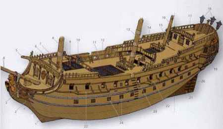 1 - форштевень, 2 - княвдигед, 3 - гальюн, 4 - бушприт, 5 - кат-балка (крамбол), 6 - кофель-нагельная планка, 7 - палуба полубака. 8 - фок-мачта, 9 - шпиль, 10 - труба камбуза. 11 - шкафут (центральный участок верхней палубы - опердека), 12 - фальшборт, 13 - грот-мачта, 14 - шканцы, 15 - паз для колдерштока (рычаг, использовавшийся в начале XVIII в. вместо штурвала), 16 - бизань-мачта, 17 - палуба полуюта, 18 - кормовые (гакабортные) огни, 19 - штульцы, 20 - перо руля, 21 - ахтерштевень, 22 - руслени (площадки для крепления вант), 23 - орудийный порт верхней палубы, 24 - крышки орудийных портов главной артиллерийской палубы (гондека).