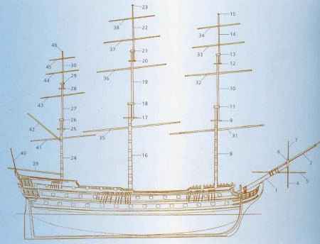 1 - бушприт; 2 - утлегарь; 3 - бом-утлегарь; 4 - мартин-гик; 5 - блинда-гафели; 6 - бушпритный эзельгофт; 7 - гюйс-шток; 8 - фок-мачта; 9 - фор марс; 10 - фор-стеньга; 11, 18. 26 - мачтовые эзельгофты; 12 - фор-салинг; 13,21, 29 — стеньговые эзельгофты; 14 - фор-брам-стеньга; 15, 23,46 - клотики; 16 - грот-мачта; 1 7 - грот-марс; 19 - грот-стеньга; 20 - грот-салинг; 22 - грот-брам-стеньга; 24 - бизань-мачта; 25 - крюйс- марс; 27 - крюйс-стеньга; 28 - крюйс-салинг; 30 - крюйс-брам-стеньга; 31 фока-рей; 32 - фор-марса-рей; 33 - фор-брам-рей; 34 фор-бом- брам-рей; 35 - грота-рей; 36 - грот-марса-рей; 37 - грот-брам-рей; 38 - грот-бом-брам-рей; 39 - бизань-гик; 40 - кормовой флагшток; 41 - бегин-рей; 42 - бизань-гафель; 43 - крюйс-марса-рей или крюйсель-рей; 44 - крюйс-брам-рей; 45 - крюйс-бом-брам-рей.