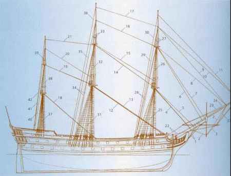 1 - ватер-шгаги; 2 - маргин-штаг; 3 - мартин-штаг от бом-утлегаря (или нижний бакштаг); 4 - фока-штаг; 5 - фок-лось-штаг; б - фор-лось-стень штаг (служит леером фор-стеньги-стакселя); 7 - фор-стень-штаг; 8 - кливер леер;9 - фор-брам-стень-штаг; 10 -бом-кливер-леер; 11 -фор-бом-брам степь-штаг; 12 - грота-штаг; 13 - грот-лось-штаг; 14 - грот-лось-стень-шгаг 15 - грот-стень-штаг; 16 - грот-брам-стень-штаг; 17 - грот-бом-брам-стень штаг; 18 -бизань-штаг; 19 -крюйс-стень-штаг;20 -крюйс-брам-стень-штаг 21 - крюйс-бом-брам-стень-штаг; 22 - ватер-бакштаги; 23 - утлегарь-бакштаги; 24 - бом-утлегарь-бакштаги; 25 - фок-ванты; 26 - фор-стень-ванты; 27 - фор-брам-стень-ванты; 28 - фор-стень-фордуны; 29 - фор-брам стень-фордуны; 30 - фор-бом-брам-стень-фордуны; 31 - грот-ванты 32 — грот стень ванты; 33 - грот брам стень ванты; 34 грот-стень-фордуны; 35 - грот-брам-стень-фордуны; 36 - грот-бом-брам-стень-фордуны 37 - бизань-ванты; 38 - крюйс-стень-ванты; 39 - крюйс-брам-стень ванты; 40 - крюйс-стень-фордуны; 41 - крюйс-брам-стень-фордуны 42 - крюйс-бом-брам-стень-фордуны.